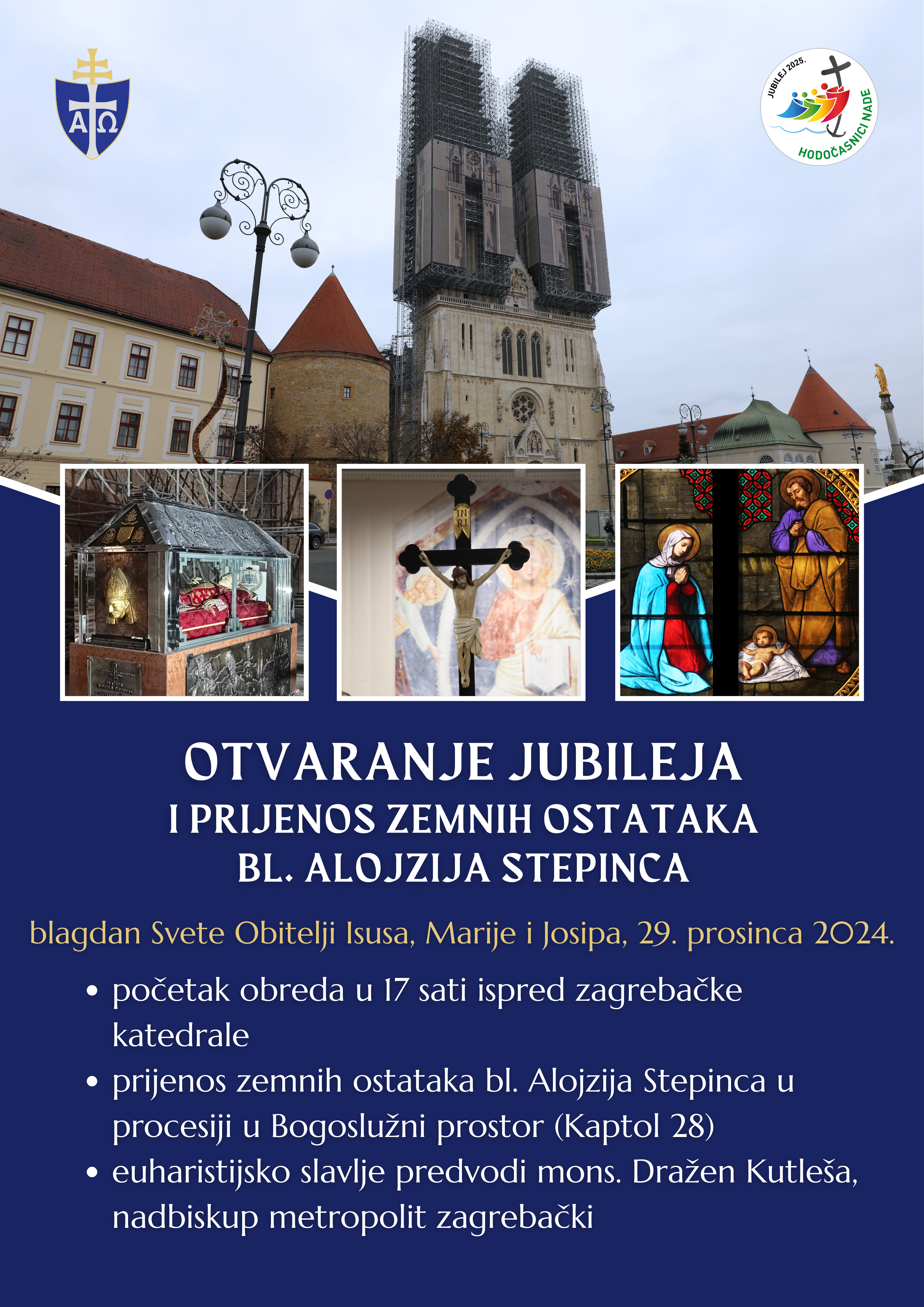 Početak Jubileja u mjesnim crkvama obilježit će se u nedjelju 29. prosinca 2024. godine, na blagdan Svete Obitelji Isusa, Marije i Josipa. Stoga će obred započeti u 17 sati ispred zagrebačke katedrale. Nakon uvodnog dijela, noseći zemne ostatke bl. Alojzija Stepinca koji će biti izloženi na čašćenje, procesija će se uputiti prema Bogoslužnom prostoru bl. Alojzija Stepinca (Kaptol 28).