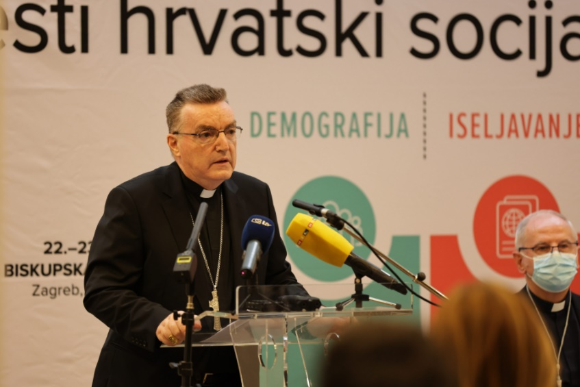 “Danas smo na pragu demografskog sloma, staračka nacija, suočena s pomanjkanjem radne snage i sa socijalno nesigurnom budućnošću. Primorani smo razmišljati o uvozu radne snage i o mudroj useljeničkoj politici koja bi trebala olakšati povratak jednom dijelu hrvatskog iseljeništva latentno zainteresiranom za povratak i o prihvaćanju onih migranata koji bježe pred ratom i prirodnim katastrofama, na način i u broju da ne destabiliziramo čitavo društvo. Ovim socijalnim tjednom Crkva želi ponovno okupiti sve kojima na srcu leži budućnost naše domovine i dobrobit hrvatskog naroda. Sloboda domovine koju imamo plaćena je tolikim mladim životima i bezbrojnim žrtvama”, istaknuo je đakovačko-osječki nadbiskup te dodao da uz pomoć i preko svoga Centra za promicanje socijalnog nauka Crkve, HBK poziva ovim socijalnim tjednom čitavo društvo: od bračnih parova, političara, gospodarstvenika, vlasnika i djelatnika u sredstvima društvenog priopćavanja, svojih svećenika i drugih pastoralnih radnika, do znanstvenika i kulturnih radnika na uzajamno slušanje, zajedničko razmišljanje i razabiranje mogućih te potrebnih koraka u vidu saniranja ozbiljne biološke ugroženosti našeg naroda te donošenja mjera dugoročne demografske obnove čitavog društva.