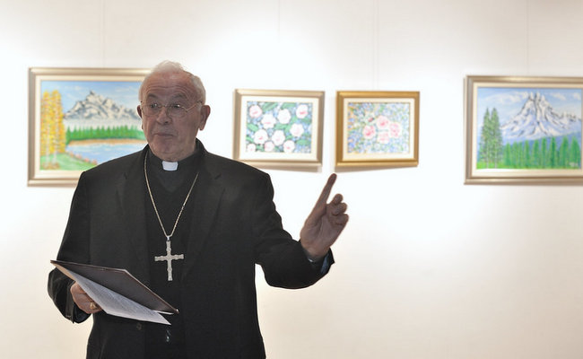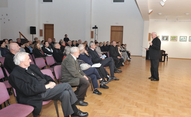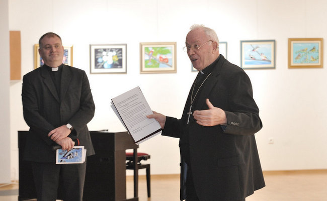 Prisutnima se obratio i sam autor prisjećajući se kako su ga mediji često okarakterizirali kao strogog i mrkog čovjeka. Vidjet ćete vi da se ja itekako znam diviti ljepoti Božje nježnosti i to pokazati slikom kazao je između ostalog biskup slikar Jezerinac, te zahvalio svima koji su mu pomogli pri ostvarenju ove izložbe a na osobit način prisutnom prof. Marijanu Jakubinu koji mu je davao slikarske savjete.