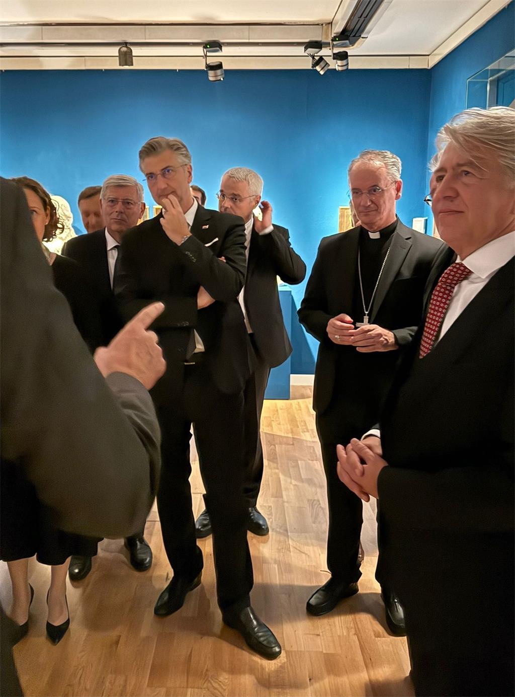 U prepunom atriju Galerije Klovićevi dvori, nakon uvodnog nastupa Ansambla LADO, okupljeno mnoštvo pozdravio je ravnatelj Galerije Antonio Picukarić te zahvalio svim institucijama, suorganizatorima i posuditeljima ove izložbe te naglasio doprinos Zagrebačke nadbiskupije i nadbiskupa mons. Dražena Kutleše koji je odobrio posudbu nekih od najvrednijih artefakata ove izložbe.