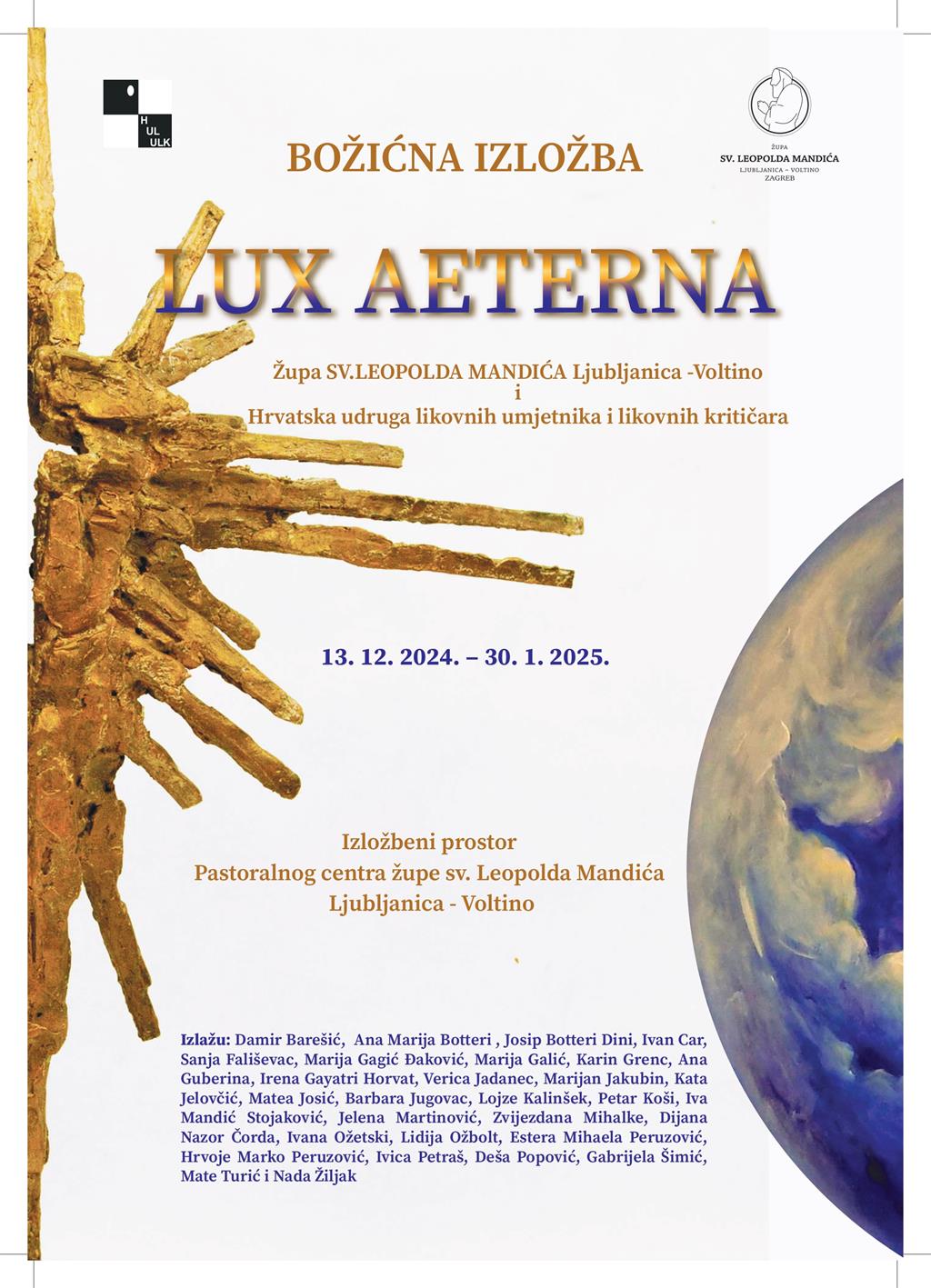 Božićna izložba "Lux aeterna" u organizaciji Župe sv. Leopolda Bogdana Mandića, Ljubljanica - Voltino i Hrvatske udruge likovnih umjetnika i likovnih kritičara održava se od 13. prosinca do 30. siječnja u Izložbenom prostoru Pastoralnog centra Župe sv. Leopolda Bogdana Mandića, Ljubljanica - Voltino. Otvorenje izložbe bit će u petak 13. prosinca u 19 sati u dvorani Ekumena.