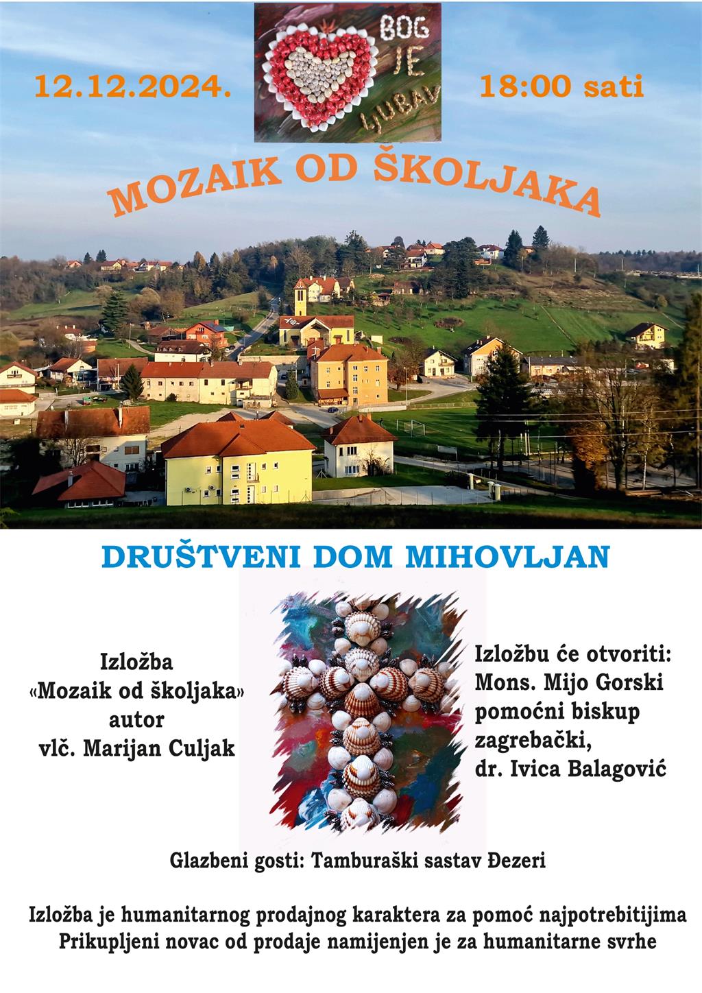 Prodajno-humanitarna izložba «Mozaik od školjaka» vlč. Marijana Culjaka održat će se u četvrtak 12. prosinca 2024. godine u Društvenom domu Mihovljan s početkom u 18 sati. Izložbu će otvoriti mons. Mijo Gorski, pomoćni biskup zagrebački i dr. Ivica Balagović. Prikupljeni novac od prodaje namijenjen je za humanitarne svrhe.