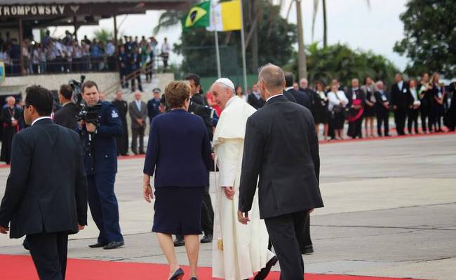 "Brazil i njegovih 50 milijuna mladih dočekuju vas raširenih ruku", rekla je predsjednica Brazila na početku svoga govora dobrodošlice Papi, potvrdivši prijateljstvo i suradnju sa Svetom Stolicom u zalaganju za mir i pravdu. Predsjednica je rekla da se "borimo protiv zajedničkog neprijatelja u svim njegovim oblicima", koji je ustao protiv "ljudskog dostojanstva", podsjetivši na osjetljivost Brazila za ono vjersko, zahvaljujući također prisutnosti mnogih vjeroispovijesti na svom tlu. Rousseff je zatim istaknula da globalizacija itekako ima utjecaja na stanje u kojem se mnogi danas nalaze i obranu dostojanstva ljudi, spomenuvši u tome kontekstu one koji trpe, koji su bez posla, rašireno nasilje i borbu protiv siromaštva u Brazilu. Prije svega tu borbu vodimo zajedno s Katoličkom Crkvom koja nastoji učiniti sve što je u njezinoj moći da pomogne siromašnima, beskućnicima i zatvorenicima. Vjera nam danas pomaže rasti, istaknula je Rousseff, rekavši kako postoje novi izazovi, misleći pritom na protuvladine prosvjede koji se u posljednje vrijeme održavaju u Brazilu i pokušaje Vlade da odgovori na njihova očekivanja.