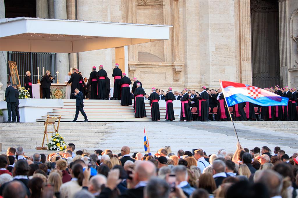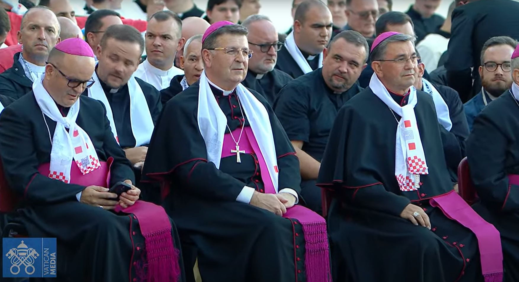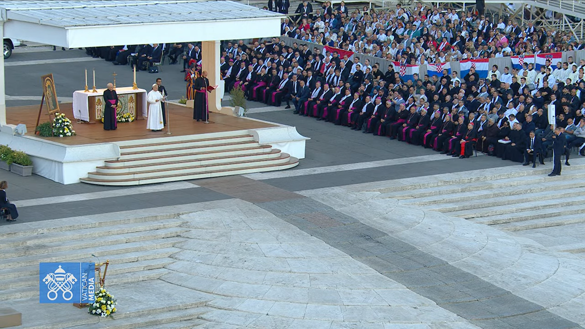 Tako ćete i dalje biti kvasac mira, dobra i nade u svijetu ranjenom nasiljem i ratovima, koji su i vama iz povijesti poznati. Neka vas Gospodin blagoslovi, a Blažena Djevica Marija, Najvjernija odvjetnica Hrvatske, čuva pod svojim plaštem i prati u svakodnevnom životu. Vama, vašim obiteljima i cijelom hrvatskom narodu od srca udjeljujem Apostolski blagoslov - znak Papine blizine i ljubavi prema svakome od vas.