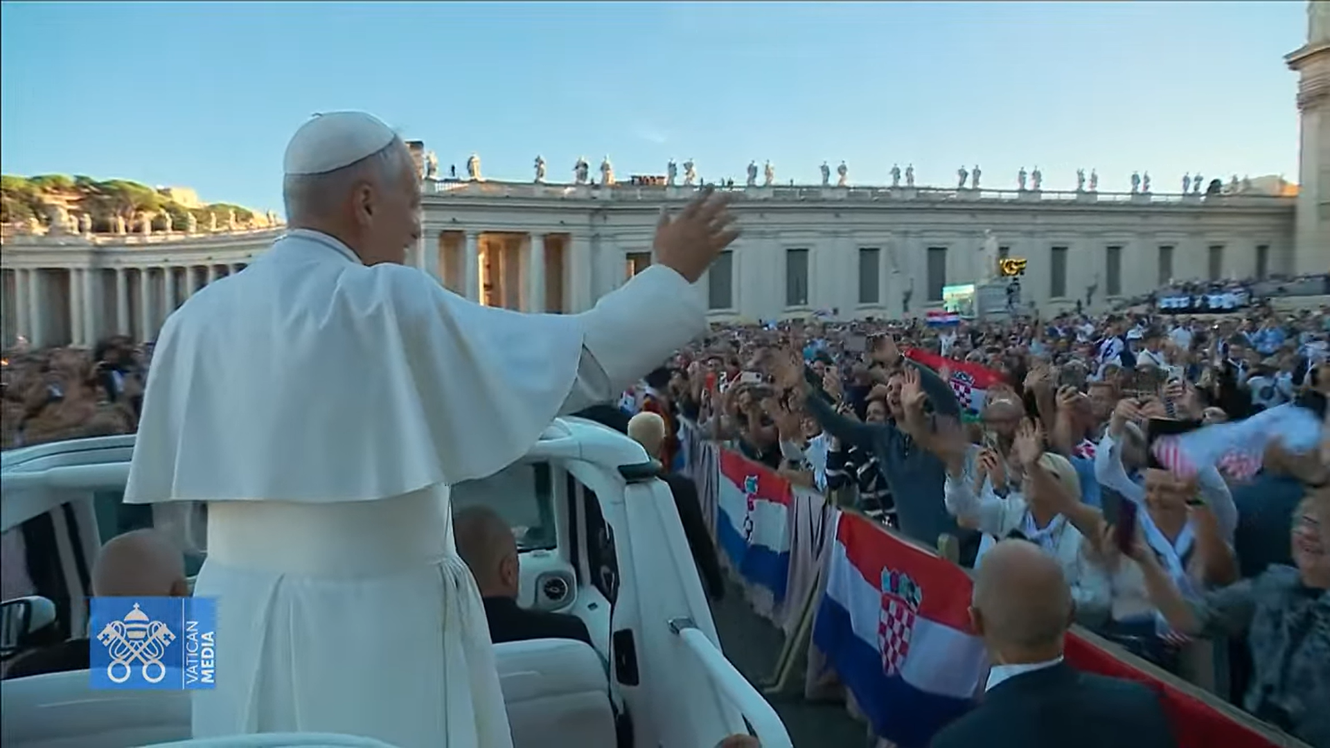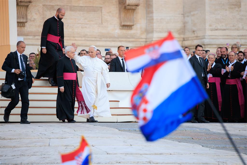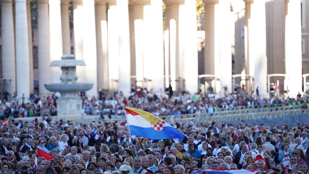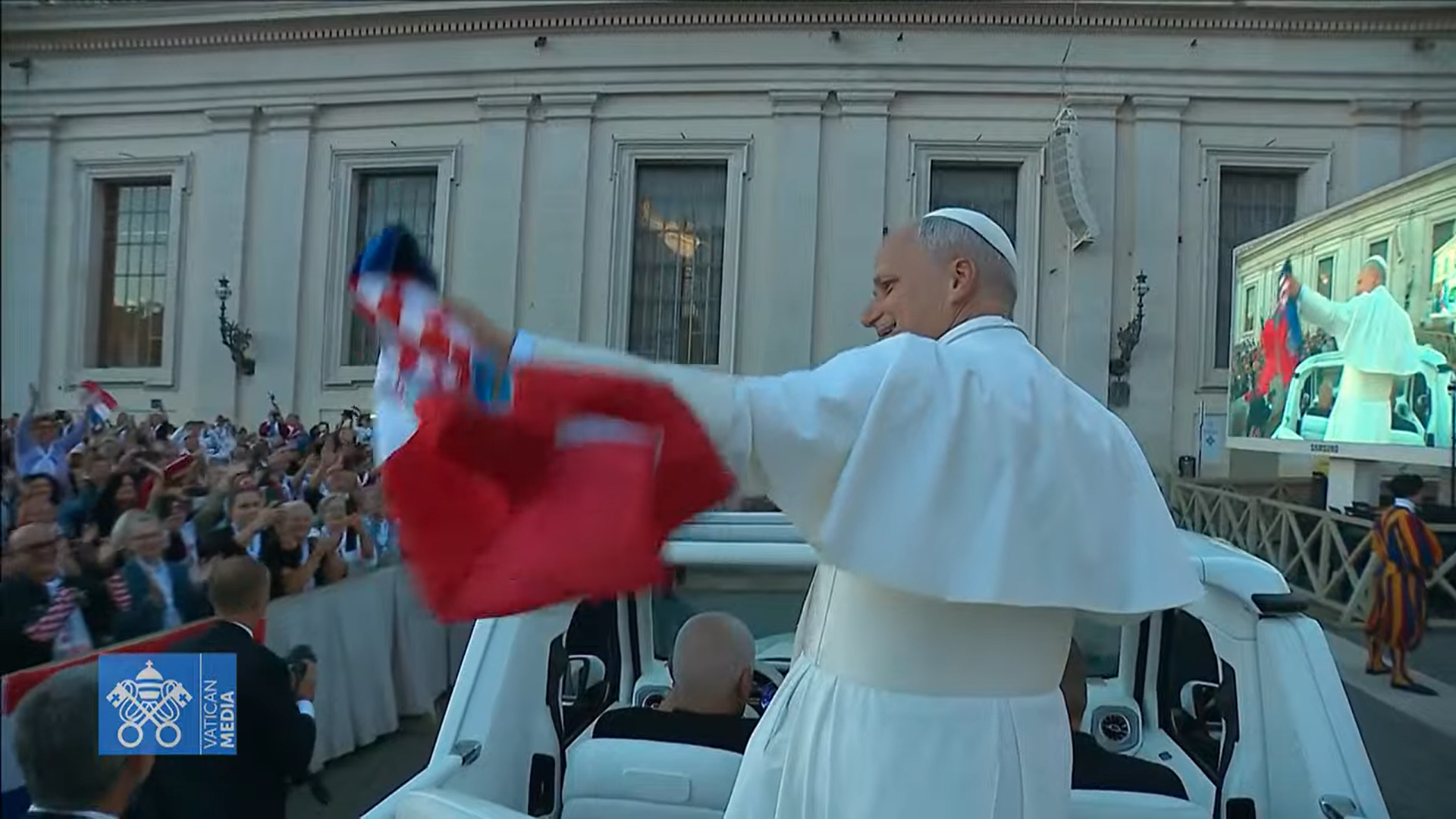 Dragi hrvatski hodočasnici, s velikom radošću želim vam dobrodošlicu na Trg sv. Petra, kamo ste pristigli povodom nacionalnog hodočašća u Jubilejskoj godini. Vaša brojna i molitvena prisutnost znak je žive vjere vašega naroda, koji je kroz stoljeća ostao čvrst u zajedništvu s Crkvom i vjeran Nasljedniku apostola Petra.