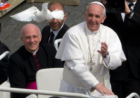 Papa Franjo je i danas tijekom svoje osme opće audijencije otvorenim automobilom došao na Trg i obišao pojedine dijelove Trga, pozdravljajući nazočne te se kao i obično zaustavljao pored male djece primajući ih u naručje i blagoslivljajući ih. Skupina vjernika mu je darovala krletku s dvije bijele golubice, koje je pustio da polete na slobodu.