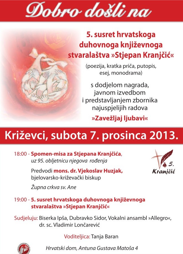 Sâm 5. susret hrvatskoga duhovnoga književnoga stvaralaštva „Stjepan Kranjčić“ započet će u 19.00 sati u križevačkom Hrvatskom domu. U toj će prigodi autori najboljih radova, prema ocjeni stručnoga ocjenjivačkog suda, biti nagrađeni, dok će odabrani radovi biti javno izvedeni u interpretaciji dramskih umjetnika Biserke Ipše i Dubravka Sidora. U glazbenom dijelu programa nastupit će Vokalni sastav „Allegro“, a scenaristica i voditeljica susreta je Tanja Baran.