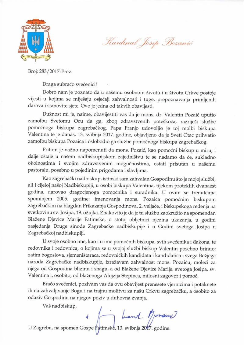 Zagrebački nadbiskup kardinal Josip Bozanić uputio je svećenicima Zagrebačke nadbiskupije pismo povodom odreknuća od službe, zbog zdravstvenih razloga, zagrebačkog pomoćnog biskupa mons. Valentina Pozaića.