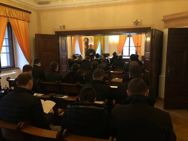 Duhovnu obnovu vodio je svećenik splitsko-makarske nadbiskupije izv. prof. dr. Ivan Bodrožić, profesor na Katoličkom bogoslovnom fakultetu Sveučilišta u Splitu. Nakon molitve Srednjeg časa, u prvom, uvodnom, nagovoru prof. Bodrožić usporedio je službu prezbitera sa službom komunalnog djelatnika. „Duhovna nečistoća nastaje hranimo li se nikakvom ili lošom duhovnošću“, rekao je Voditelj. Tako svećenik treba biti, između ostaloga, i komunalni djelatnik na području duhovnog života te tako čistiti duhovne nečistoće. Ukoliko svećenik želi čistiti i čisti druge, onda je važno da on sam bude čist – po uzoru na levite u Starome zavjetu koji su bili postavljeni za čišćenje naroda. Svjestan svoje slabosti, prezbiter je pozvan da i sam često pristupa sakramentu svete ispovijedi koji nam omogućava da budemo što sličniji Kristu, ali isto tako da i sami mehanički ne slavimo sakramente – naglasio je prof. Bodrožić.