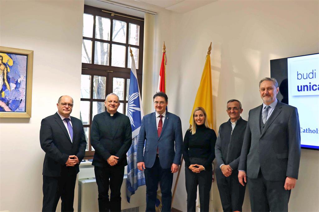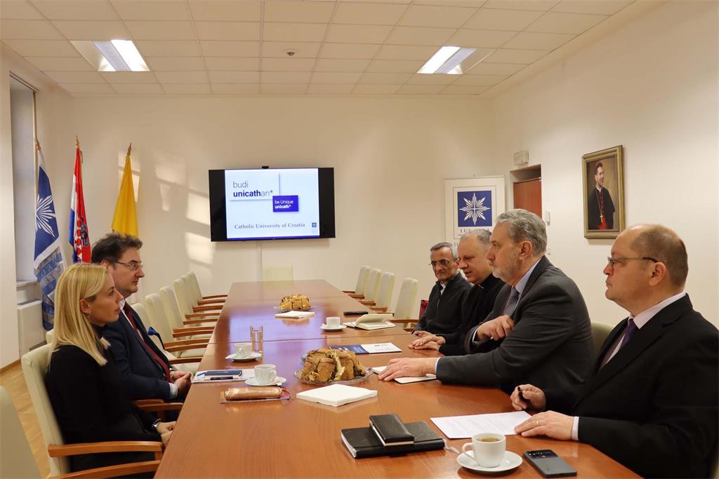 U petak 7. veljače 2025. Hrvatsko katoličko sveučilište posjetili su dekan Pravnog fakulteta prof. dr. sc. Laslo Komáromi i prodekanica za međunarodnu suradnju prof. dr. sc. Petra Lea Láncos sa Sveučilišta Pázmány Péter u Budimpešti. U Vijećnici su se susreli s našim rektorom prof. dr. sc. Željkom Tanjićem, prorektorom za znanost prof. dr. sc. Robertom Antolovićem, prorektorom za kvalitetu, identitet i poslanje prof. dr. sc. Antom Crnčevićem i v. d. dekana Pravnog fakulteta HKS doc. dr. sc. Kristianom Turkaljem.