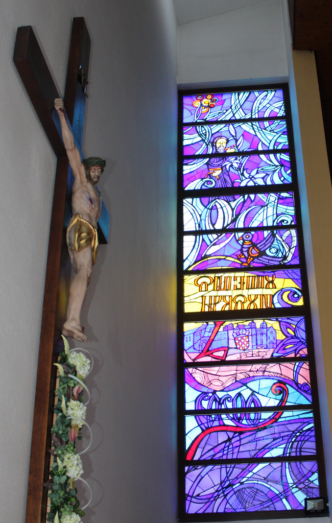 To su temelji hrvatske likovne umjetnosti nadahnute svetim pismo. Ujedno ta rana hrvatska umjetnost potvrđuje kulturne veze hrvatske sa cijelim kršćanskim svijetom. I ne samo tada, hrvatska umjetnost kroz vjekove ostaje uključena i sadržajno i oblikovno sa drugim kršćanskim kulturnim narodima. Desni Vitraj prikazuje svetog Josipa također nadahnutog jednim Zadarskim starohrvatskim reljefom. On drži u ruci ljiljan, znak njegove čistoće; na vitraju je hrvatskom glagoljicom ispisano ime sveti Josip. Vitraj prikazuje na isti načni kao onaj lijevi, na valovima hrvatske kulturne svete baštine, hrvatsku domovinu, posebno kroz lepršanje hrvatskog stijega i blistavog grba na njemu. Na stijegu zapaža se utvrđeni grad, simbol otpornosti u zajedništvu, gledajući grad pomišljamo i na Jeruzalem, na vječni grad kojega sveti Ivan Evanđelist naviješta kao novi Jeruzalem u kojem svjetlost sja uvijeke. "Ta slava ga Božja obasjala i svjetiljka mu je jaganjac", objašnjava Botteri.