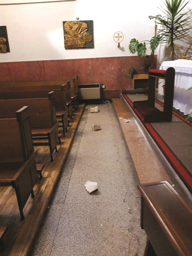 Na istočnom pročelju raspucao se pokrovni vijenac u uglu spoja broda crkve i prednjeg dijela. Na krovnom prozoru puklo je armirano staklo.