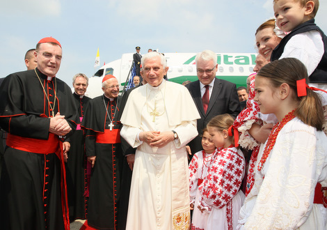 „S velikom radošću dolazim među vas kao hodočasnik u ime Isusa Krista. Srdačno pozdravljam ljubljenu hrvatsku zemlju i, kao nasljednik apostola Petra, velikim zagrljajem grlim sve njezine stanovnike“, prve su riječi koje je Benedikt XVI. uputio došavši na hrvatsko tlo. (Cjeloviti govor Svetoga Oca Benedikta XVI. u zagrebačkoj zračnoj luci pročitajte OVDJE.)
