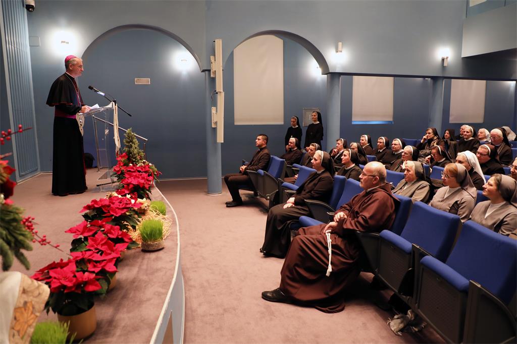 Na kraju, nadbiskup Kutleša osvrnuo se na poziv na obnovu i djelovanje te poručio kako je Božić poziv na novi početak. "Svjetlo koje je zasjalo u betlehemskoj noći lijek je za tamu svijeta, ali i za sjene koje ponekad nastane naša srca. To svjetlo, Krist, poziva nas na osobnu obnovu, na jačanje vjere i na djelotvornu ljubav prema drugima. Božić nas poziva na otvorenost izazovima u osluškivanju što Duh govori Crkvi iz čijeg je srca redovništvo životnom i svetom snagom opskrbljivalo udove tijekom cijele njezine povijesti. U duhu Božića, neka svaka zajednica prepozna svoju posebnu zadaću i usmjeri snage na ono što Bog traži. Potrebe svijeta i Crkve su velike: siromaštvo, osamljenost, nepravda i duhovna glad prisutni su svuda oko nas. Postalo je lakše materijalno zbrinuti one u potrebi, a tu ulogu danas često preuzimaju razne društvene institucije. Zadovoljiti duhovnu glad i znati na nju odgovoriti puno je teže. To je poslanje vaših zajednica danas. Moći ćete ga vršiti ako same budete duhovno izgrađene i zrele u vjeri."