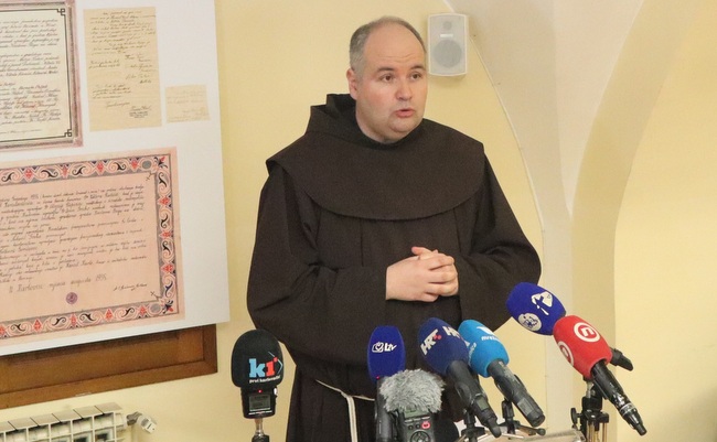 Konferenciju za medije otvorio je domaćin fra Krunoslav Albert, župnik i gvardijan koji je izrazio radost ovim otkrićem i ukratko opisao proces skidanja križa i jabuke tornja 2. ožujka 2021. Naglasio je da se iz Kronike samostana mogu pratiti obnove crkve i tornja, ali da ipak jedna obnova o kojoj svjedoči jedan svitak nije zabilježena u Kronici te je podsjetio okupljene novinare i znanstvenike da je Kroniku iz perioda 1930-tih pa do 1949. oduzela tadašnja komunistička vlast i do danas nije nađena niti vraćena.