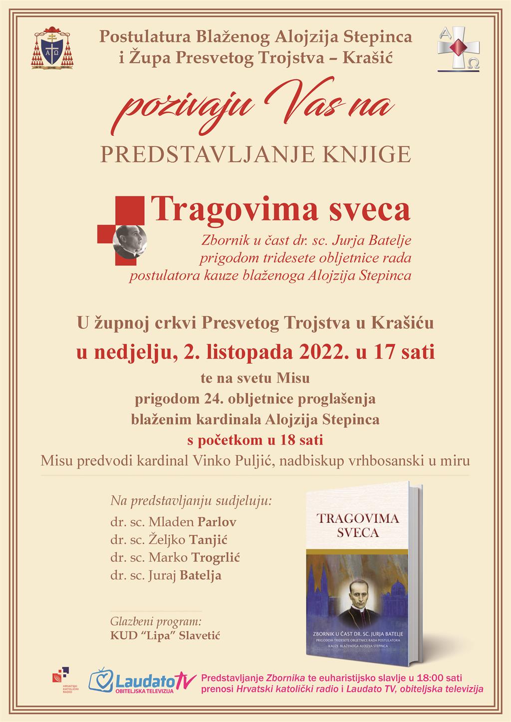 Tragovima sveca – riječ je o zborniku radova u čast mons. dr. sc. Jurja Batelje u prigodi tridesete obljetnice njegova rada kao postulatora kauze blaženog Alojzija Stepinca. Nakon predstavljanja Zbornika bit će svečana sveta misa povodom 24. obljetnice proglašenja blaženim kardinala Stepinca, koju će predslaviti uzoriti gospodin kardinal Vinko Puljić, vrhbosanski nadbiskup u miru.