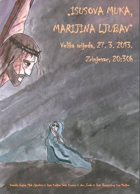 Mladi okupljeni u dramsku skupinu Mala zajednica iz župe Kraljice svete krunice (Ravnice) i mladi zbora Jordan iz župe Bezgriješnog srca Marijina (Jordanovac) okupili su se kako bi skupa u zagrebačkom parku Zrinjevac, u samom centru grada, kroz autorsku predstavu „Isusova muka, Marijina ljubav“ prikazali zadnje sate Isusova života.