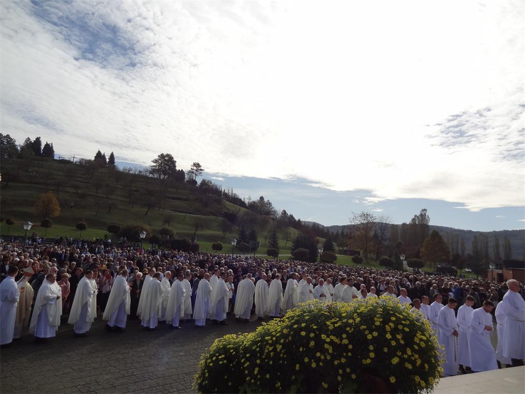 Nakon svečane euharistije uslijedilo je štovanje relikvija prvog stupnja sv. Ivana Pavla II., sv. Faustine i bl. Mihaela Sopoćka, te križni put bistričkom Kalvarijom i pobožnost u čast Božjega milosrđa u kojima je sudjelovao i sam biskup Komarica. Prije završnog blagoslova i čina posvete svijeta Božjem milosrđu po riječima sv. Ivana Pavla II., kojim je zaključen susret, biskup Komarica zahvalio je svima prisutnima, a napose o. Andrzeju Wośku SCJ, koordinatoru Koordinacije štovatelja Božjega milosrđa. Istaknuo je da ovo vrijeme vapi za Božjim milosrđem, te da je potrebno uz pomoć Duha Svetoga truditi se prepoznavati znakove vremena. Primjer takvoga truda vidljiv je i u akciji koju je biskup Komarica proveo sa svojim svećenicima, odlučivši da svaka obitelj koja je ostala na svom ognjištu u Banjolučkoj biskupiji, njih oko jedanaest i pol tisuća obitelji, dobije sliku Milosrdnog Isusa: „tako da su se carinici na granici čudom čudili, otkud to idu tolike slike, četiri i pol tone slika Milosrdnog Isusa!“ Pozvao je na molitvu za „raskršćanjenu“ Europu, ali i za braću vjernike u susjednoj Bosni i Hercegovini, za vjernike u banjolučkom kraju, srednjoj Bosni, i u istočnoj Bosni, „gdje protivnici Krista žele fizički iskorijeniti svakoga od katolika i uništiti svaki znak i uspomenu na nazočnost Katoličke Crkve. Nemojmo se svojom nezainteresiranošću svrstavati u protivnike Kristova križa i Kristova življenog evanđelja koju naša braća i sestre u Bosni svjedoče svojim životima, nego ih sve preporučimo Božjem milosrđu“, zaključio je Biskup. (jv)