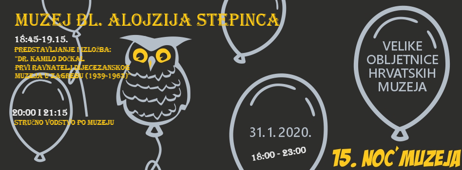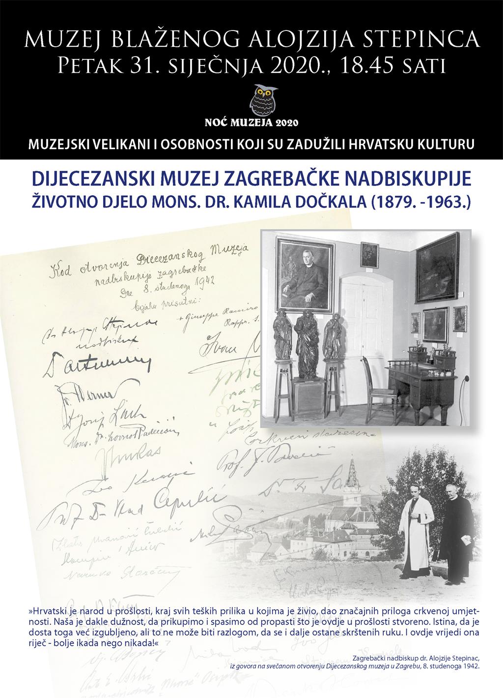 Prigodom manifestacije „Noć muzeja 2020“, u petak 31. siječnja, Muzej bl. Alojzija Stepinca predstavit će u okviru ponuđene teme „Muzejski velikani i osobnosti koji su zadužili hrvatsku kulturu“, uz utemeljitelja Dijecezanskoga muzeja u Zagrebu bl. Alojzija Stepinca, prvog ravnatelja i organizatora Muzeja zagrebačkog kanonika dr. Kamila Dočkala.