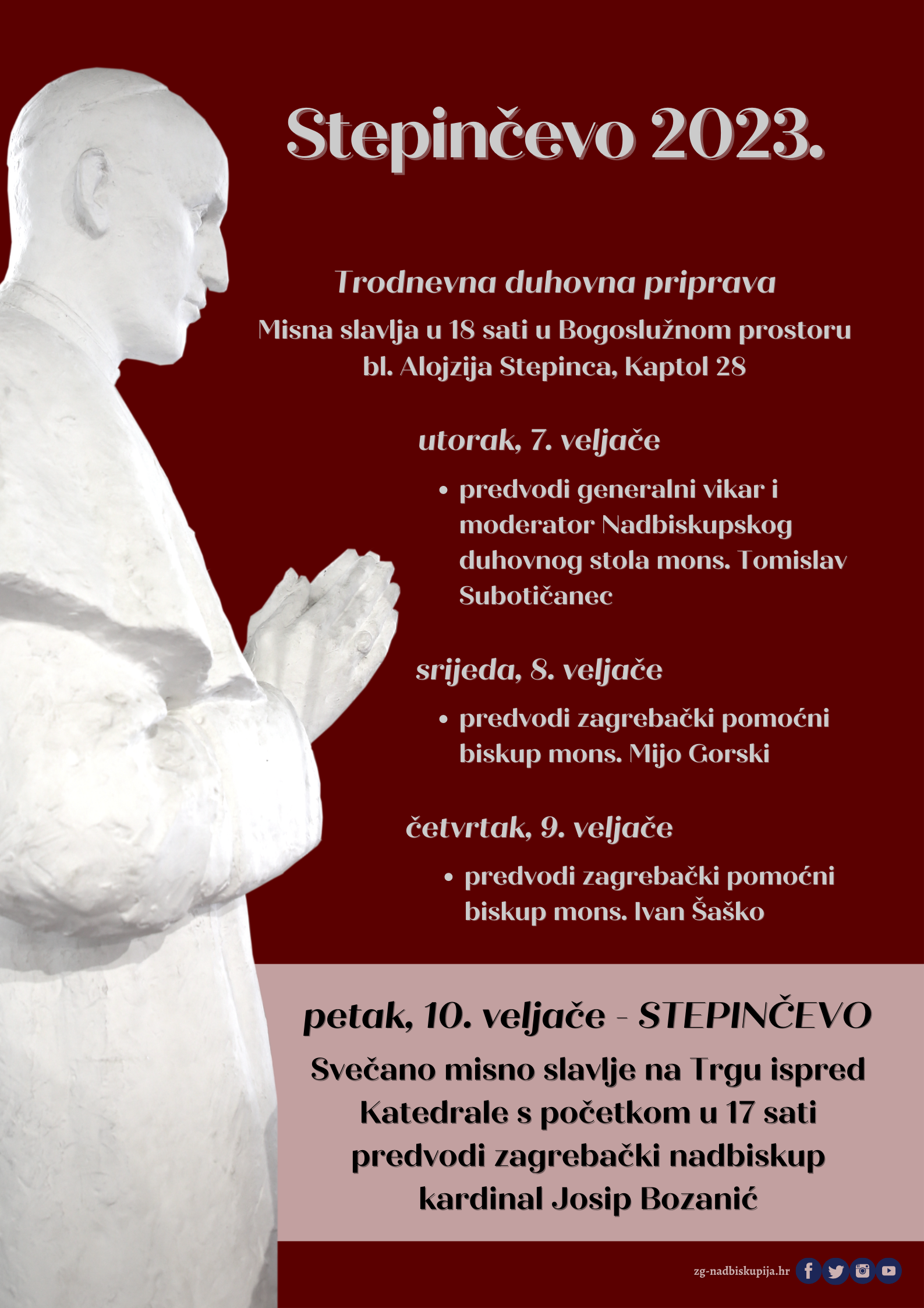 Na blagdan bl. Alojzija Stepinca, u petak 10. veljače 2023. godine, zagrebački nadbiskup kardinal Josip Bozanić predvodit će svečano euharistijsko slavlje na Trgu ispred katedrale s početkom u 17 sati.