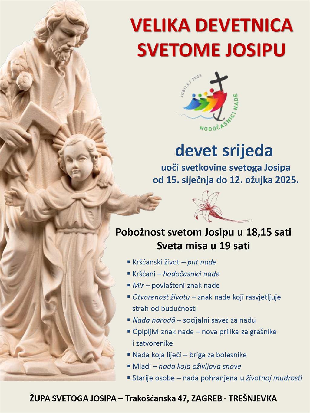 Župa svetog Josipa na zagrebačkoj Trešnjevki priprema se za proslavu svog nebeskog zaštitnika velikom devetnicom koja započinje u srijedu 15. siječnja, a traje do srijede 12. ožujka. Tijekom devet srijeda vjernici će se pripremati za svetkovinu sv. Josipa pobožnošću krunice i litanija sv. Josipu u 18.15 sati te svetom misom u 19 sati.