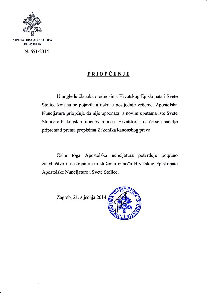Uredu Zagrebačkog nadbiskupa dostavljeno je 21. siječnja 2014. godine, priopćenje Apostolske Nuncijature u Republici Hrvatskoj koje prenosimo u cijelosti: