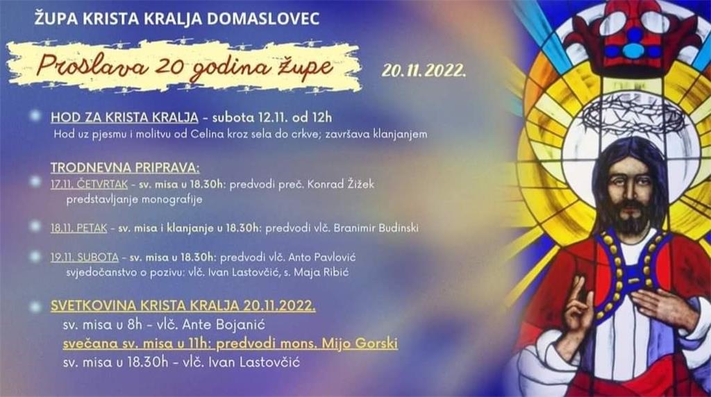 Župa Krista Kralja u Domaslovcu slavi 20 godina svog postojanja. Bogat program očekuje se tijekom trodnevnice koja započinje sljedeći četvrtak, 17. studenog, a završava na svetkovinu Krista Kralja, u nedjelju 20. studenog, kada će svetu misu u župnoj crkvi predvoditi pomoćni biskup zagrebački mons. Mijo Gorski.