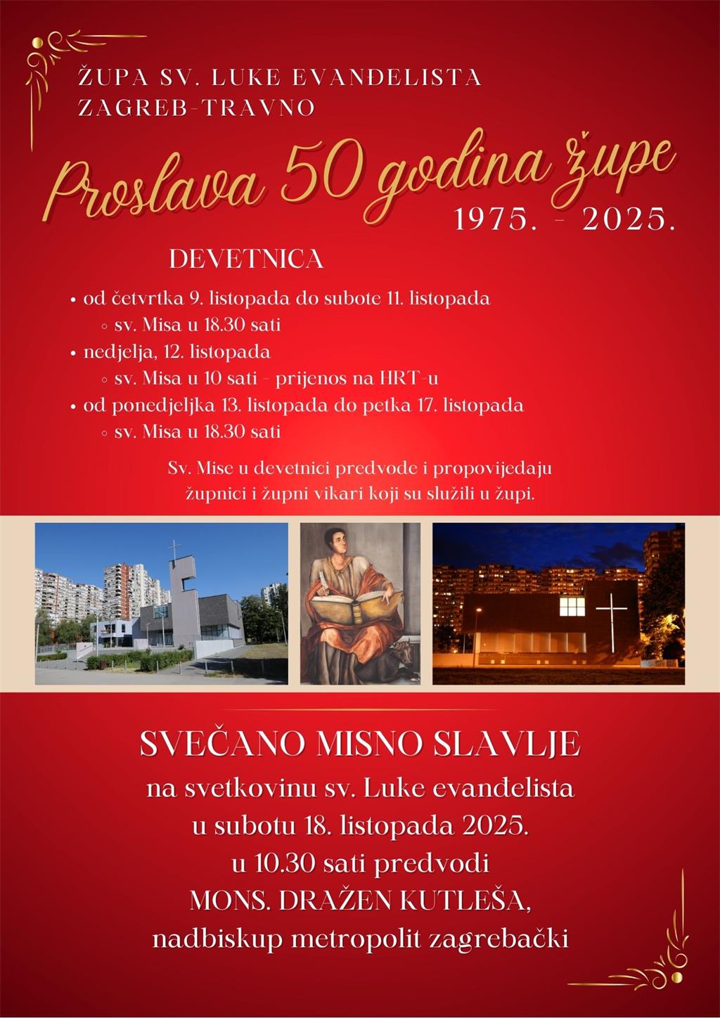 Župa sv. Luke evanđelista proslavit će 50 godina župe na župnu svetkovinu sv. Luke u subotu 18. listopada svečanim misnim slavlje u 10.30 sati koje će predvoditi zagrebački nadbiskup mons. Dražen Kutleša.