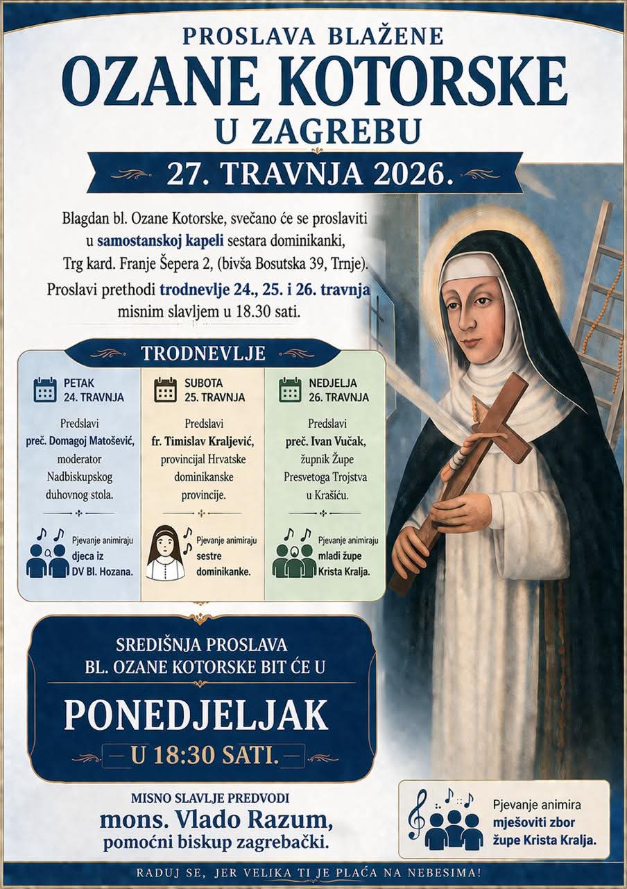 Svečano misno slavlje na blagdan bl. Ozane Kotorske u ponedjeljak 27. travnja u samostanskoj kapeli sestara dominikanki predvodit će pomoćni biskup zagrebački mons. Vlado Razum s početkom 18.30 sati.