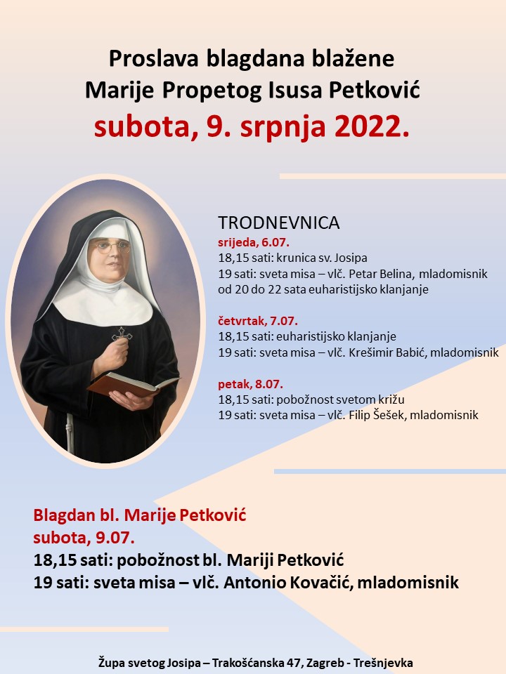 Blagdan bl. Marije Propetog Petković proslavit će se u subotu 9. srpnja u crkvi sv. Josipa na Trešnjevci misom koju će u 19 sati predvoditi mladomisnik Antonio Kovačić.