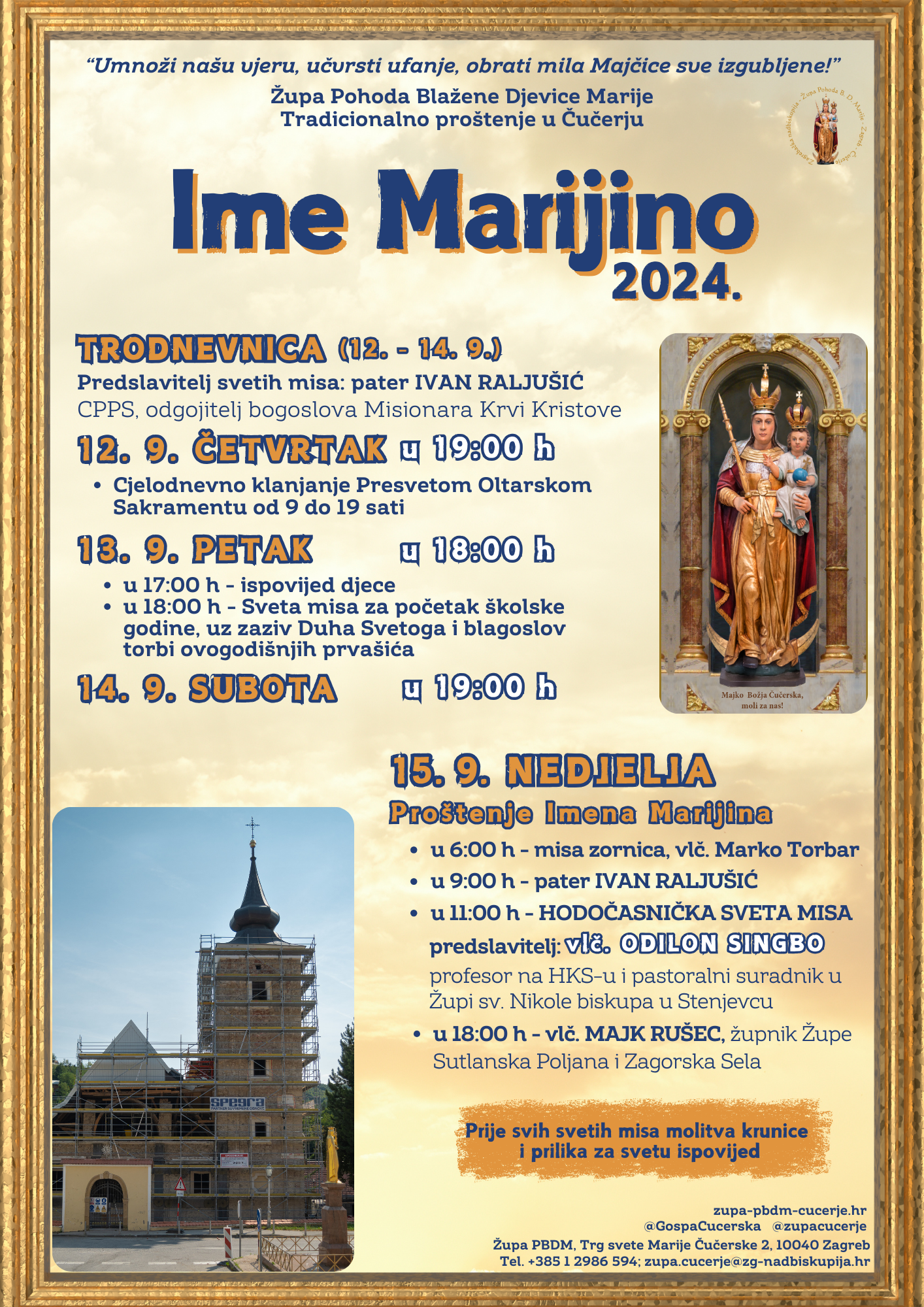 Proslava blagdana Imena Marijinog, župno proštenje u Župi Pohoda Blažene Djevice Marije u Čučerju, najavljena je za nedjelju 15. rujna 2024. godine.