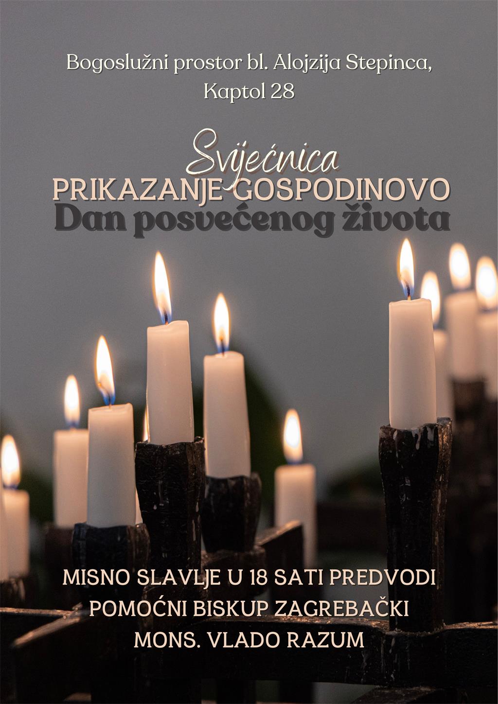 Proslava Dana posvećenog života u Zagrebačkoj nadbiskupiji održat će se na blagdan Prikazanja Gospodinova, u ponedjeljak 2. veljače 2026. godine u Bogoslužnom prostoru bl. Alojzija Stepinca (Kaptol 28).