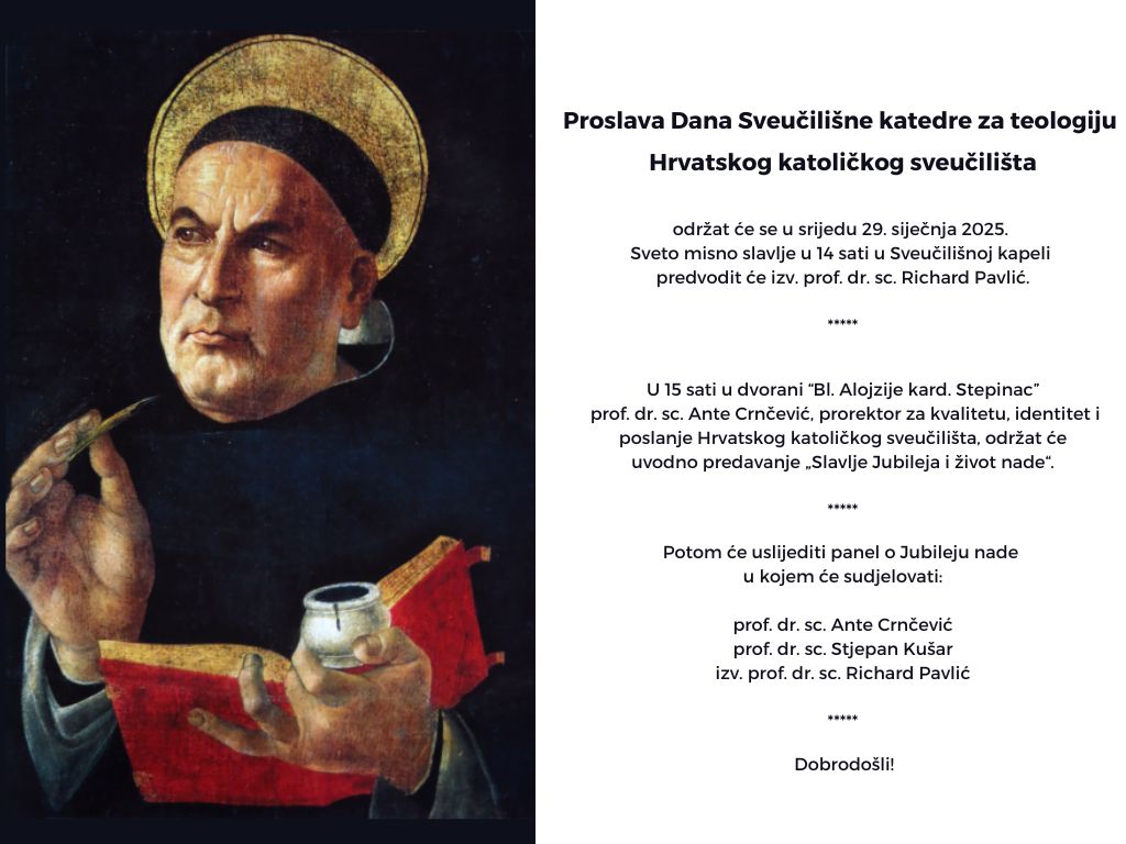 Proslava Dana Sveučilišne katedre za teologiju Hrvatskog katoličkog sveučilišta održat će se u srijedu 29. siječnja 2025. Sveto misno slavlje u 14 sati u Sveučilišnoj kapeli predvodit će izv. prof. dr. sc. Richard Pavlić.