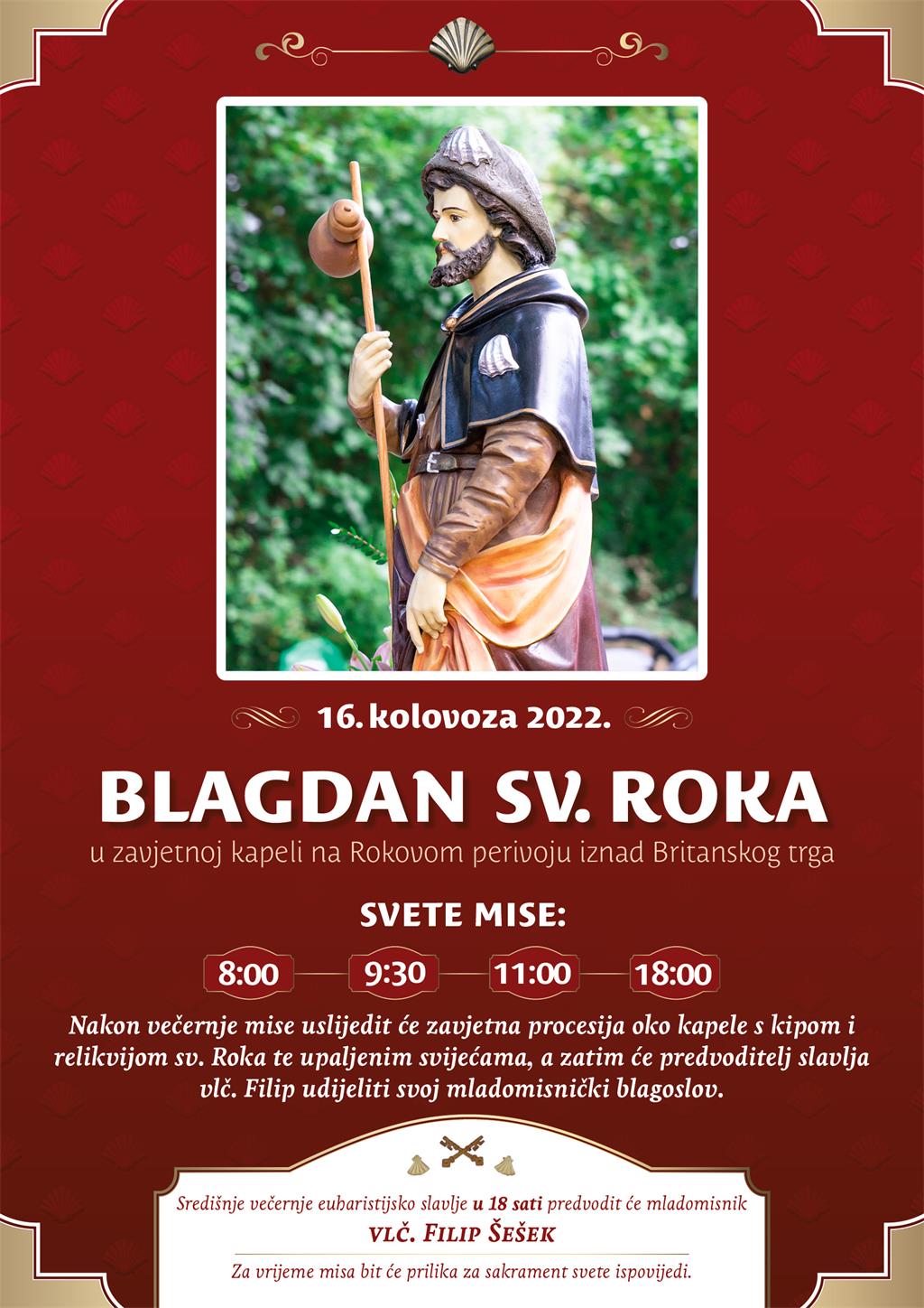Blagdan sv. Roka u Zagrebu svečano će se proslaviti u utorak 16. kolovoza 2022. u zavjetnoj kapeli u Rokovom perivoju iznad Britanskog trga.