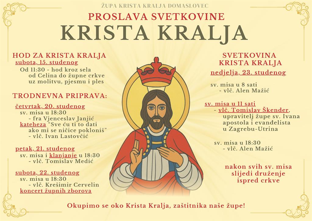 Župa Krista Kralja u Domaslovcu proslavit će župnu svetkovinu i 23. obljetnicu postojanja u nedjelju 23. studenog.