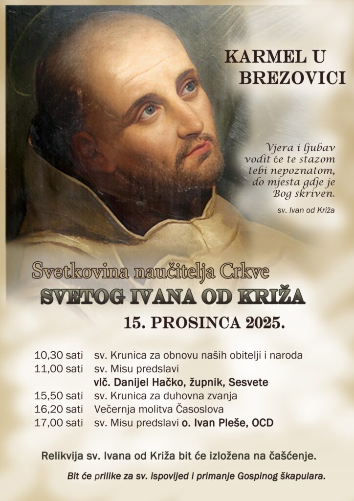 Karmel u Brezovici svečano obilježava svetkovinu naučitelja Crkve, sv. Ivana od Križa, u ponedjeljak, 15. prosinca.