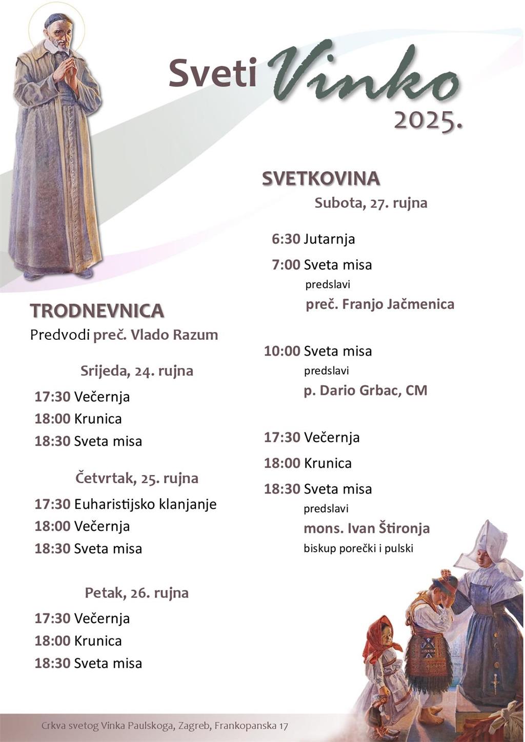 Svetkovina sv. Vinka Paulskoga proslavit će se u subotu 27. rujna u Kući matici sestara milosrdnica u Zagrebu. Svečano misno slavlje u 18.30 predslavit će porečki i pulski biskup Ivan Štironja.