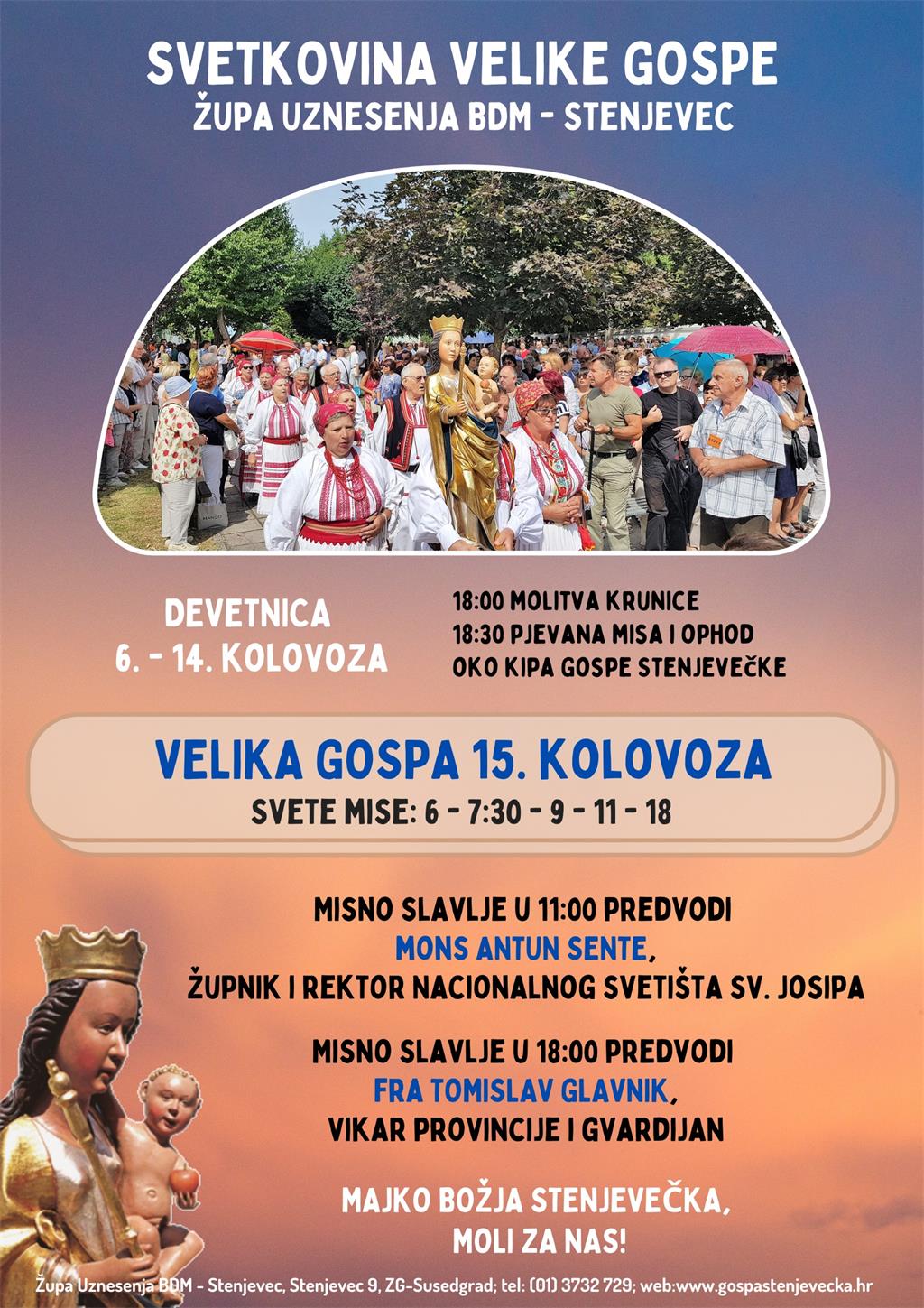 Svaku večer devetnice započinjemo u 18:00 marijanskom pobožnošću nakon koje će uslijediti pjevano večernje misno slavlje, a na kraju slavlja molit će se posvetna molitva Gospi Stenjevečkoj te ophod oko njezina kipa.