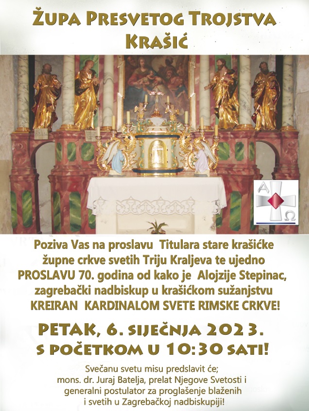Župa Presvetog Trojstva - Krašić poziva vas na proslavu Titulara stare krašićke župne crkve svetih Triju Kraljeva te ujedno 70. obljetnicu od kako je papa Pio XII. kreirao Alojzija Stepinca, nadbiskupa zagrebačkog u krašićkm sužanjstvu kardinalom Svete Rimske Crkve u petak, 6. siječnja 2023. s početkom u 10:30 župnoj crkvi Presvetog Trojstva u Krašiću.