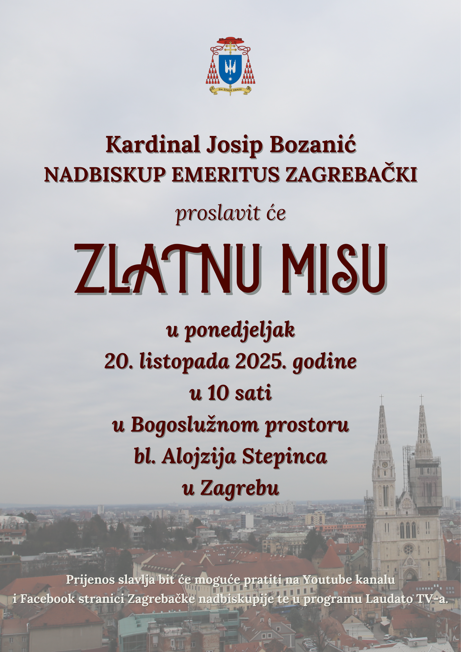 Kardinal Josip Bozanić, nadbiskup emeritus zagrebački, proslavit će 50. obljetnicu svećeničkog ređenja u ponedjeljak 20. listopada 2025. godine euharistijskim slavljem u Bogoslužnom prostoru bl. Alojzija Stepinca (Kaptol 28), s početkom u 10 sati.