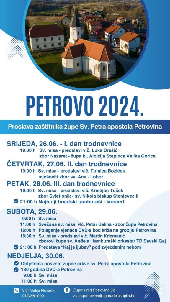Župa Petrovina svečano će proslaviti svetkovinu svoga zaštitnika sv. Petra u subotu 29. lipnja 2024. te obljetnicu posvete crkve u nedjelju 30. lipnja.