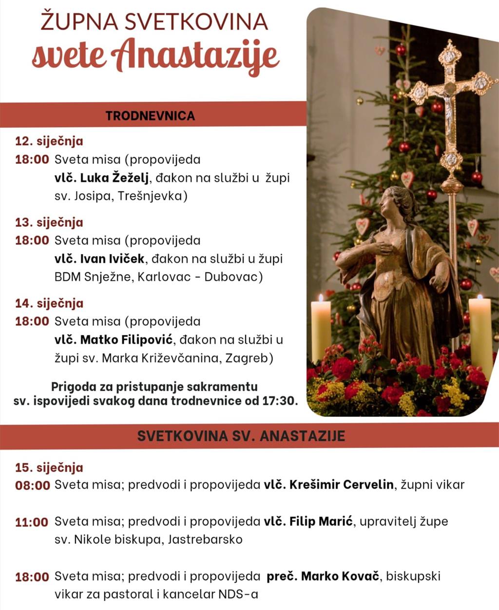U srijedu 15. siječnja Župa svete Anastazije, mučenice u Samoboru proslavit će svoju župnu svetkovinu. Svete mise su u 8, 11 i 18 sati. Drugog dana trodnevne priprave za proslavu župne svetkovine propovijedat će vlč. Ivan Iviček, đakon na službi u Župi BDM Snježne, a posljednjeg dana trodnevice homiliju će uputiti vlč. Matko Filipović, đakon na službi u Župi sv. Marka Križevčanina.