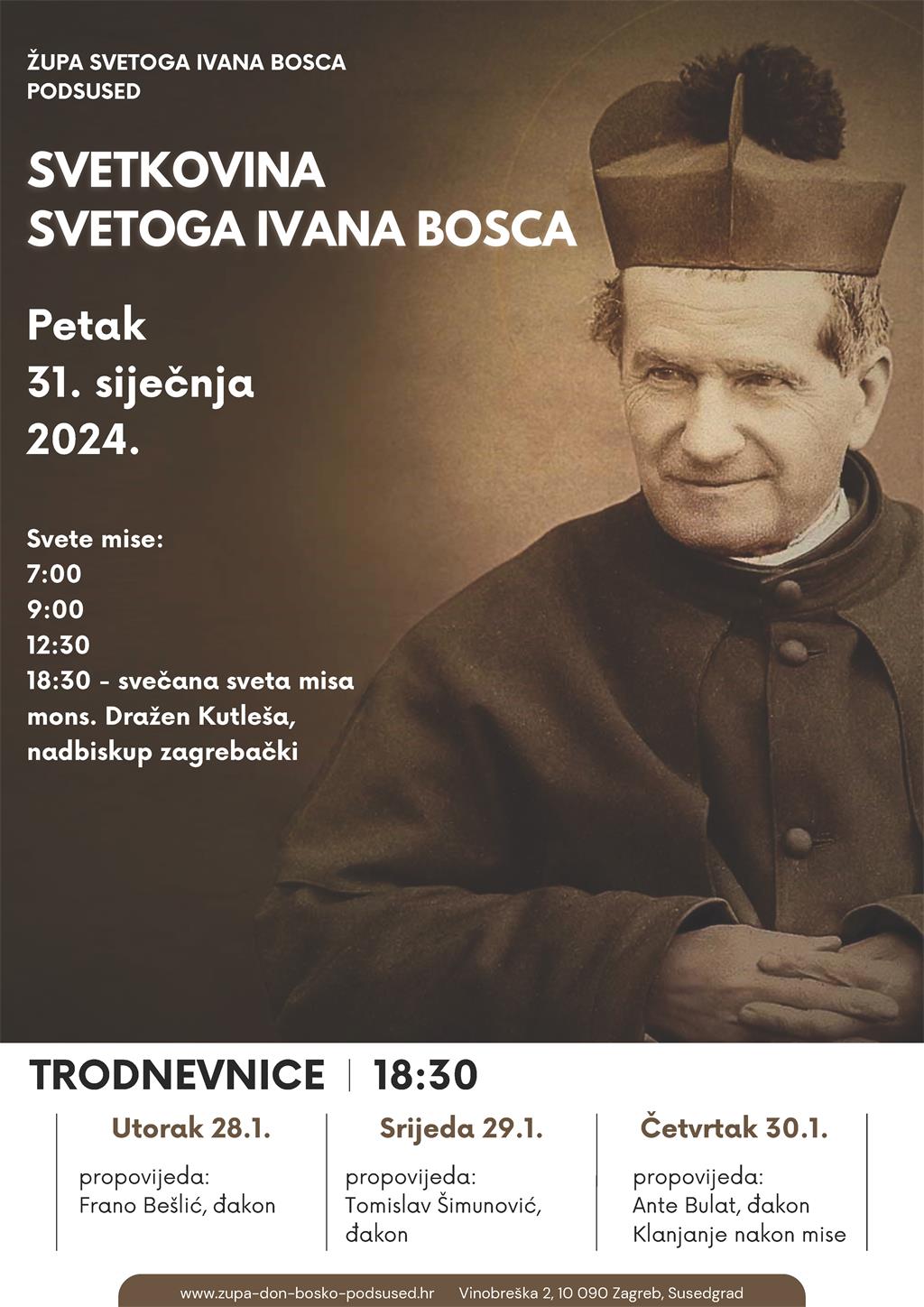 Župa sv. Ivana Bosca u Podsusedu proslavit će župnu svetkovinu u petak 31. siječnja. Svete mise su u 7, 9 i 12.30 sati, a središnje misno slavlje u 18.30 sati predvodit će zagrebački nadbiskup mons. Dražen Kutleša.