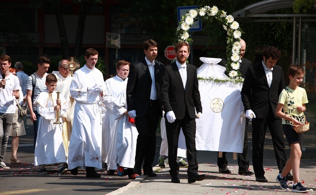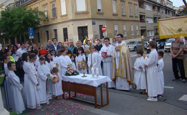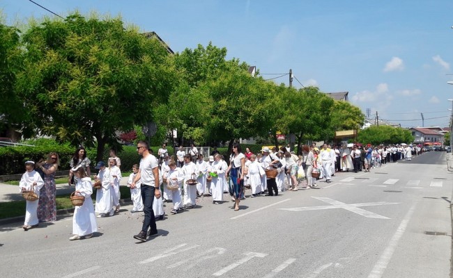 Prva je postaja bila u školskom dvorištu, druga na platou, treća i četvrta u parku odakle se krenulo do Pastoralnoga centra gdje je svečana procesija i završila. U procesiji su iza zastava - župne, hrvatske i papinske – četvorica svečano odjevenih župljana nosila za ovu prigodu posebno izrađeno i ukrašeno prijenosno postolje za čašćenje Presvetog. Današnja je svečana procesija potvrdila da i ondje gdje nema zgrade crkve, ima vjere i onih koji su ju spremni javno svjedočiti, na što je u svojem obraćanju župljanima pri završetku svečane procesije opetovano pozvao župnik Antun Vukmanić.