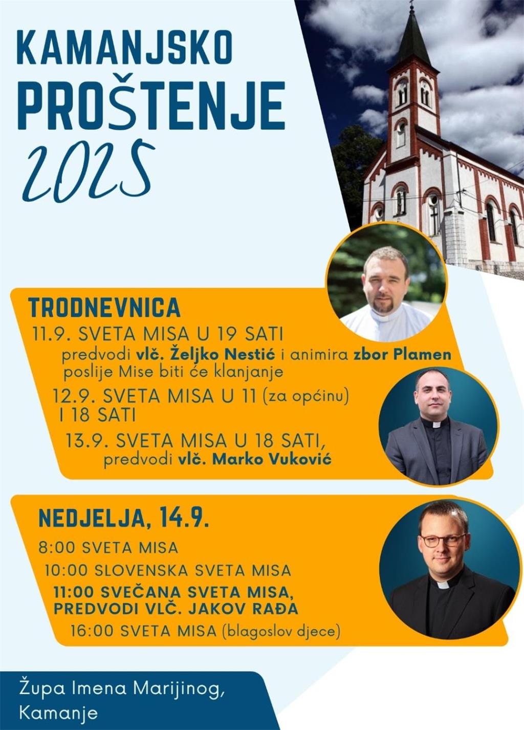 Župa Imena Marijinog u Kamanju proslavit će svoj titular u nedjelju 14. rujna 2025. svečanim misnim slavljem u 11 sati koje će predvoditi povjerenik za pastoral duhovnih zvanja vlč. Jakov Rađa. Istoga dana slavit će se svete mise u 8 sati, u 10 sati na slovenskom jeziku te misa u 16 sati s blagoslovom djece.