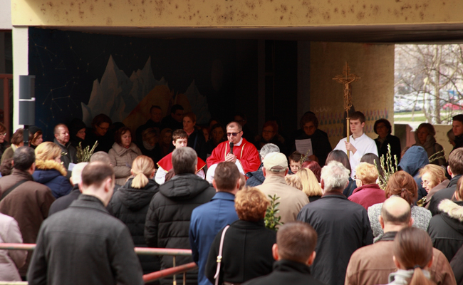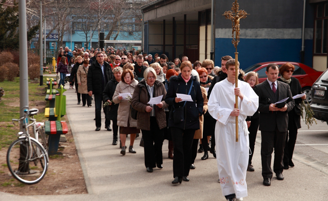 Na Cvjetnicu, u nedjelju 25. ožujka 2018., mnoštvo se župljana okupilo ispred ulaza u Pastoralni centar blaženoga Alojzija Stepinca na Trnjanskoj Savici u Zagrebu.
