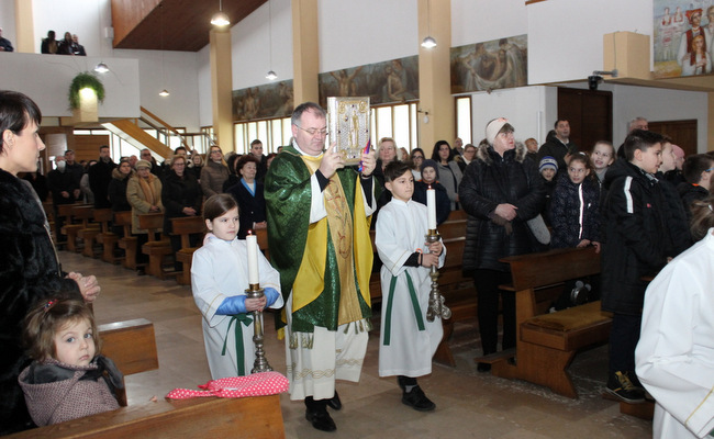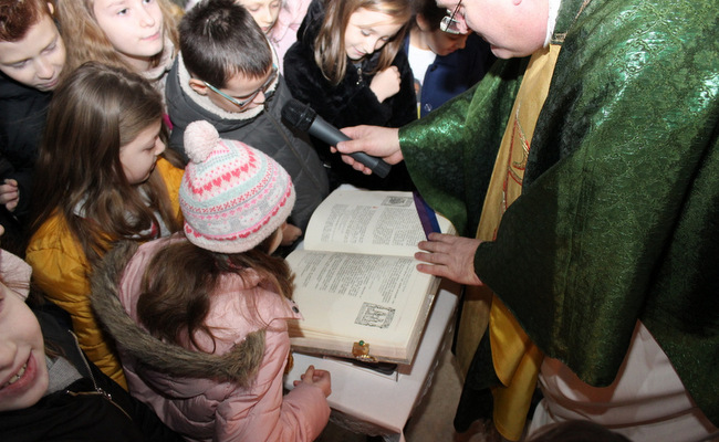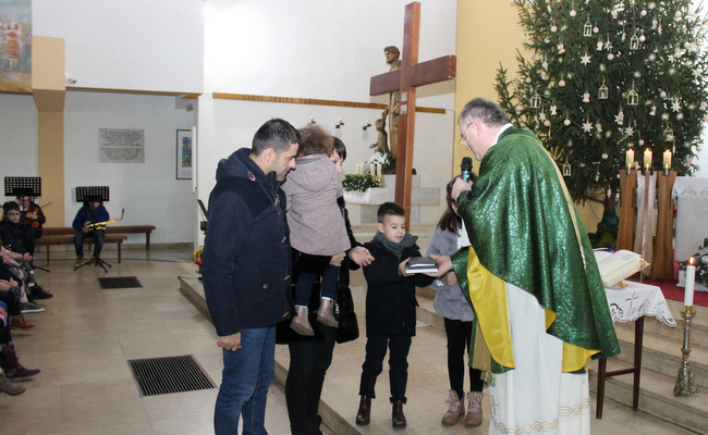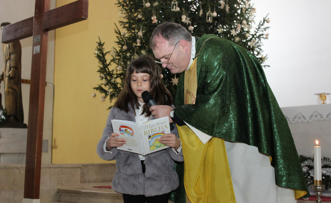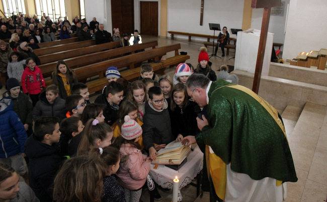 Pri kraju homilije mons. Sente je pozvao Anu Huljinu učenicu trećeg razreda osnovne škole da iz Biblije namijenjene djeci pročita opis nedjeljnog evanđelja te njoj i cijeloj njenoj obitelji predao veliku i malu bibliju, s uputom da te knjige često otvaraju i iz njih čitaju u svom obiteljskom domu. (A.S.)