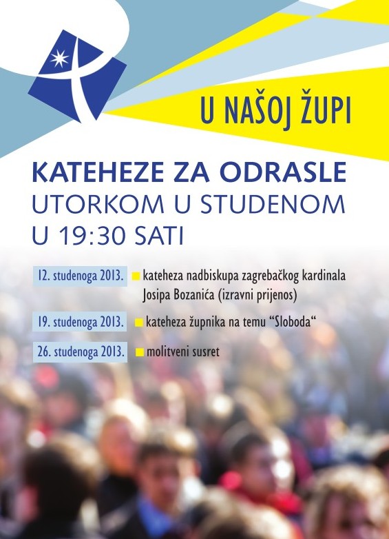 Kateheze za odrasle održavat će se svakog utorka kroz cijelu pastoralnu godinu – od studenog do lipnja, osim u mjesecu siječnju. Jednom mjesečno, katehezu će predvoditi zagrebački nadbiskup kardinal Josip Bozanić. Kako bi dospjela do što većeg broja vjernika, Kardinalova kateheza će se uživo prenositi putem interneta, dok su ostali utorci u mjesecu predviđeni za župnikovu katehezu te molitveni susret.