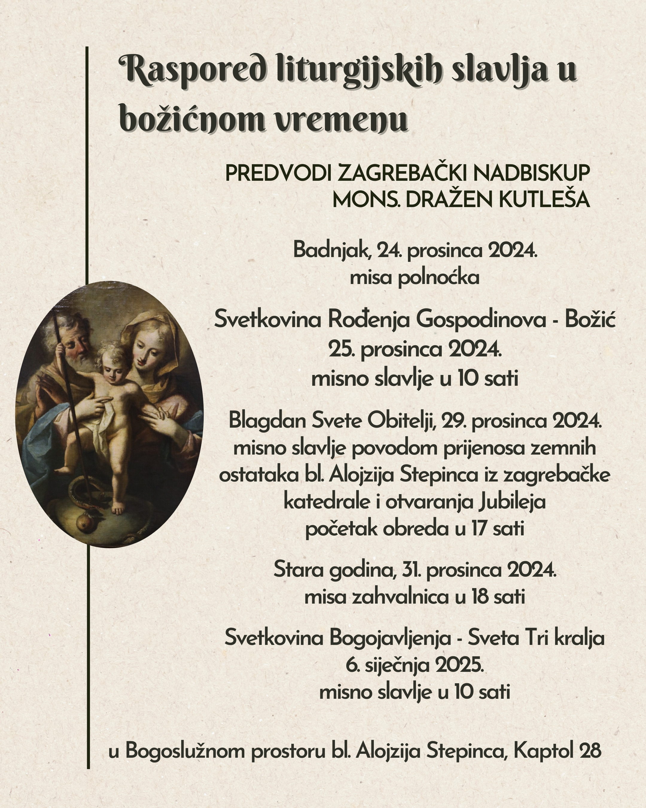 Zagrebački nadbiskup u miru kardinal Josip Bozanić na Badnjak, u utorak 24. prosinca, predvodit će misu bdjenja u Bogoslužnom prostoru bl. Alojzija Stepinca (Kaptol 28), s početkom u 18 sati.
