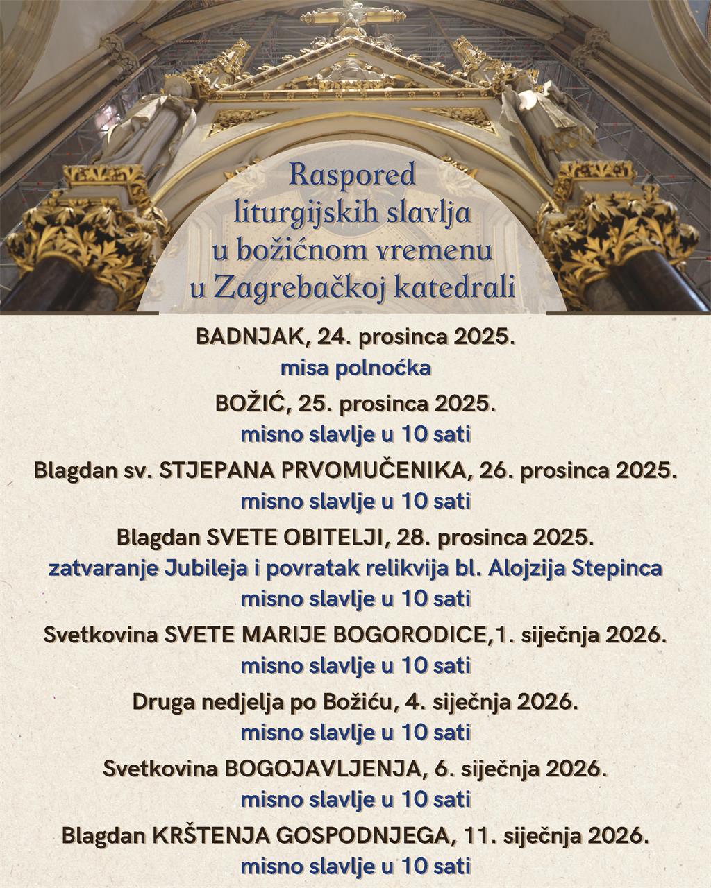 Nakon pet godina svete mise ponovno će se slaviti u Zagrebačkoj katedrali. U nastavku donosimo raspored slavlja u božićnom vremenu u Zagrebačkoj katedrali te u Bogoslužnom prostoru bl. Alojzija Stepinca.